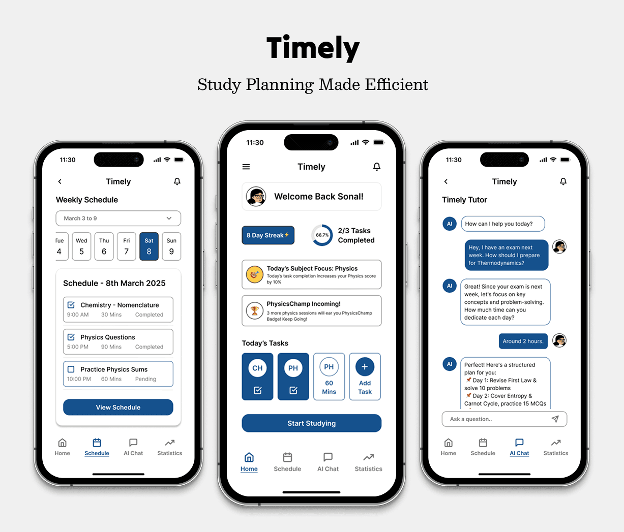 Timely, an AI-powered study planner that creates personalized, distraction-free timetables for students based on their syllabus, productivity patterns, and preferences.
