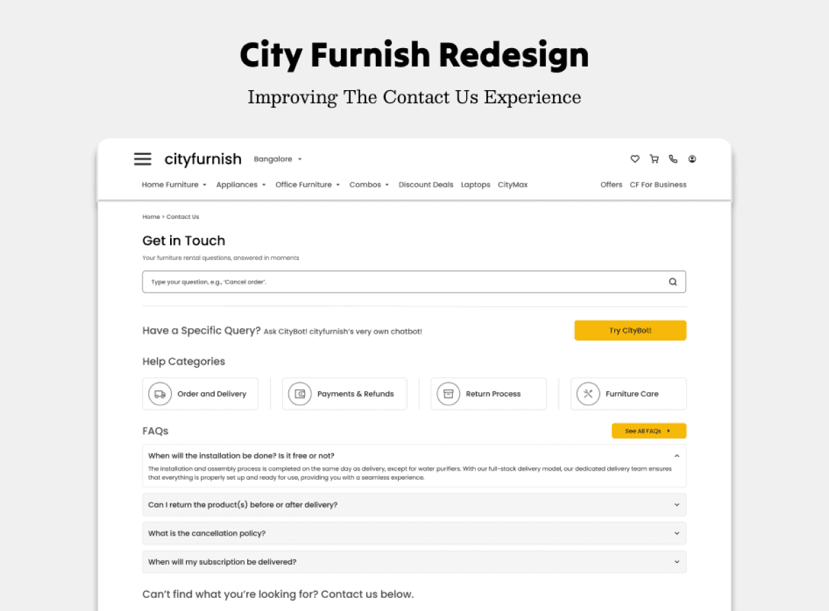 Redesign of Cityfurnish’s “Contact Us” experience to reduce user drop-offs, increase clarity, and streamline issue resolution.