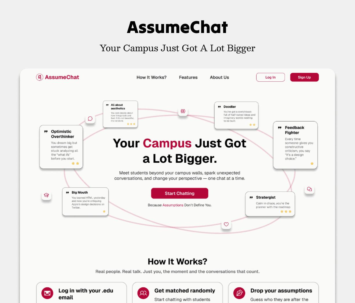 Assume Chat is a website exclusively for college students to chat, talk and discover other students. Basically Omegle for students but safe, fun and with lots of assumptions to defy.