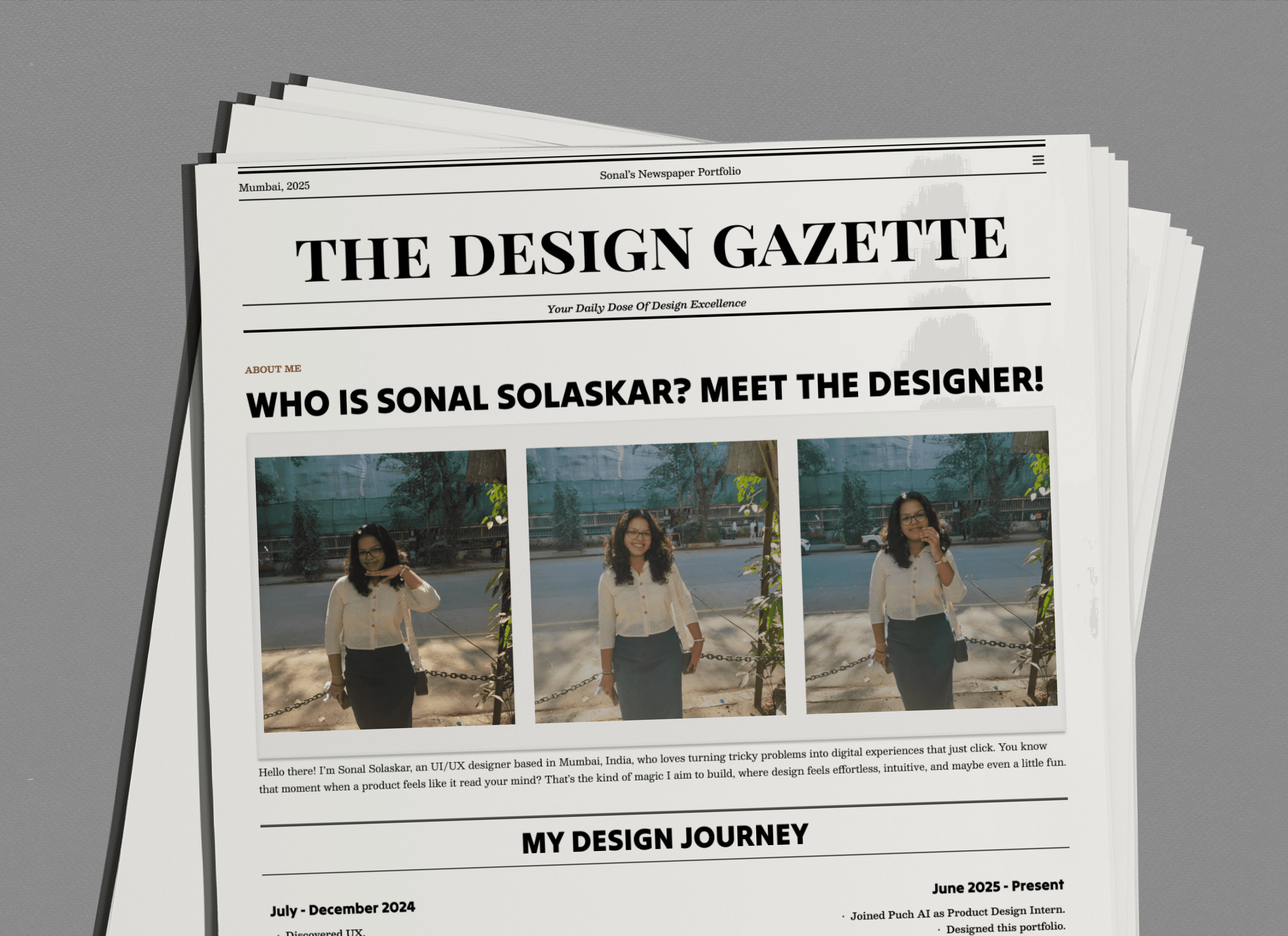 Think of this as a newspaper of Sonal’s design journey, filled with stories, experiments, and a little bit of chaos turned into clarity. From case studies to side projects, what you’ll find here is a collection of work rooted in curiosity, crafted with care, and always driven by people.